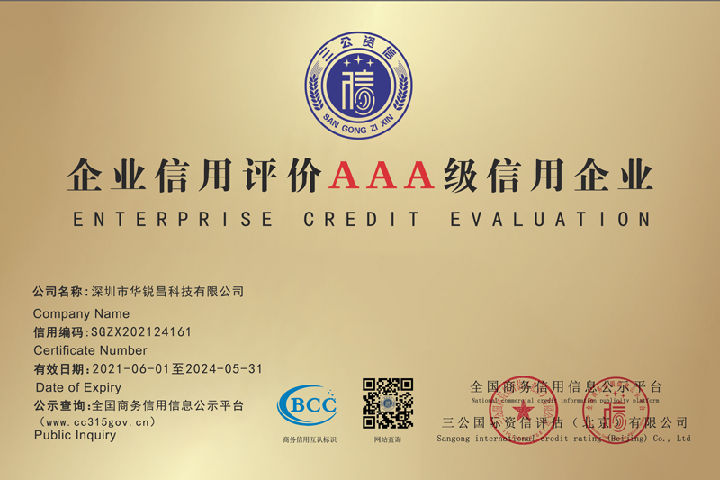 深圳市华锐昌科技有限公司的资产规模、信用记录、管理水平、顾客满意度、发展前景等多方面进行了严格、全面的分析与审核,深圳市华锐昌科技有限公司凭借优秀的品牌认知度和社会美誉度,获得了“企业信用评价AAA级信用企业”这一重量级荣誉。