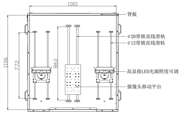 3.箱体内部(如上图)中间安装有摄像头移动平台(如下图), 平台下安装两根带锁直线滑轨,平台可前后移动,也可移动到某- -位置锁紧滑轨固定。
