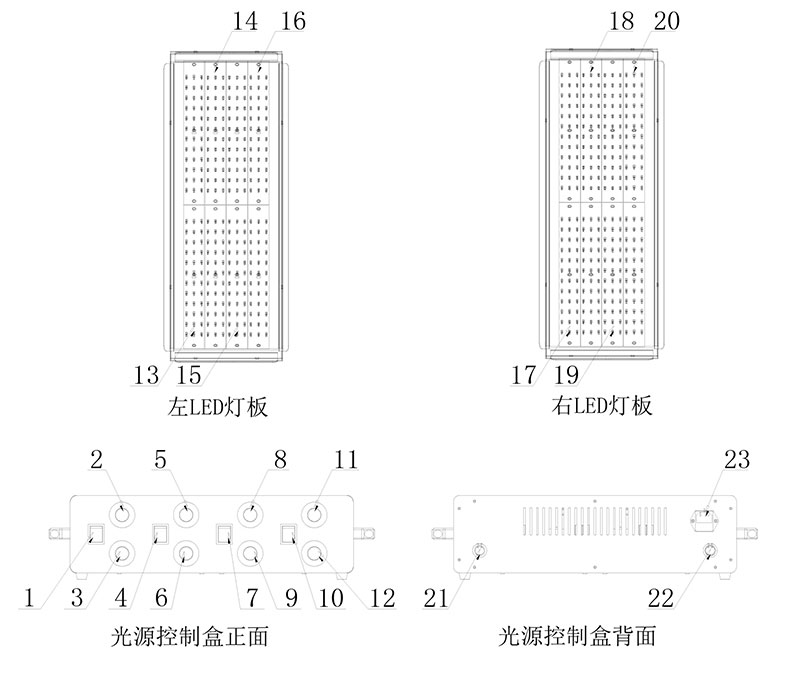 19-右3路LED光源 20- -右4路LED光源 21-LED电源连接线插头1 22-LED电源连接线插头 23-光源控制盒插座