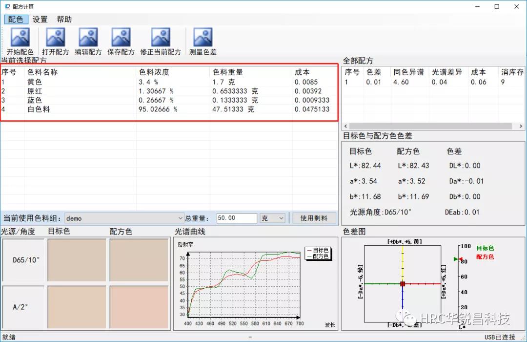 HRC华锐昌分光测色仪精度较高,用了预定位板的设定,免去了传统测色仪、色差仪校准过程中需要使用标准黑板和白板的过程,内置软件功能强大,包含所有必要的色彩方程式、适合不同任务的标准光源,及大量特定行业及应用的指标,光谱式的测量原理,提供了很高的测量精度,再配合使用专业的配色软件电脑调色,指定完整的颜色管理方案。
