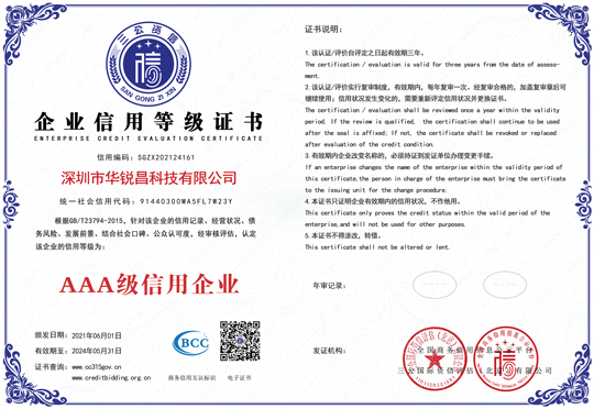 深圳市华锐昌科技有限公司的资产规模、信用记录、管理水平、顾客满意度、发展前景等多方面进行了严格、全面的分析与审核,深圳市华锐昌科技有限公司凭借优秀的品牌认知度和社会美誉度,获得了“企业信用评价AAA级信用企业”这一重量级荣誉。