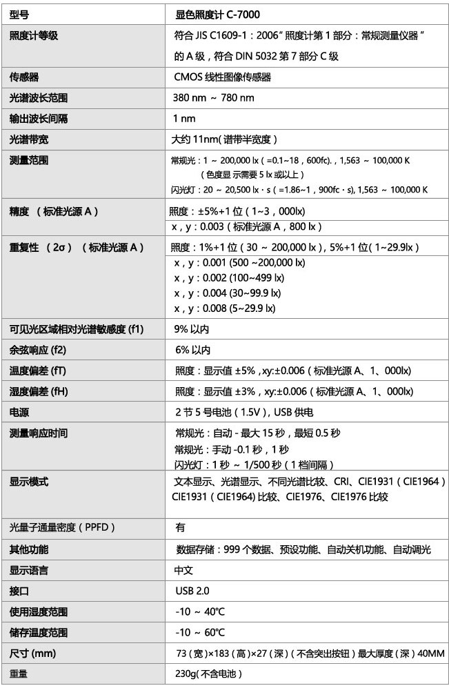 赛科尼可.世光SEKONIC显色照度计C-7000是一款小巧、易用的光源(包括LED照明和EL照明)测量仪器,可提供CRI显色指数、光谱辐射照度、峰值波长、三刺激值、色度、相关色温、特征波长、色纯度、照度以及差值测量的入门级解决方案,显色照度计C—7000是一款轻便的手持式测量仪器,用于测量光源(包括全新的LED和EL光源)的色彩和照度。测量数据是以CRI显色指数、三刺激值、照度、色度、特征波长、色纯度、相关色温和与目标的差值形式显示的,C—7000可搭配另购的闪光同步线进行摄影闪光灯的光谱测量,作为标准配件随附的实用软件内含了用于数据捕捉和分析的更多高级功能。