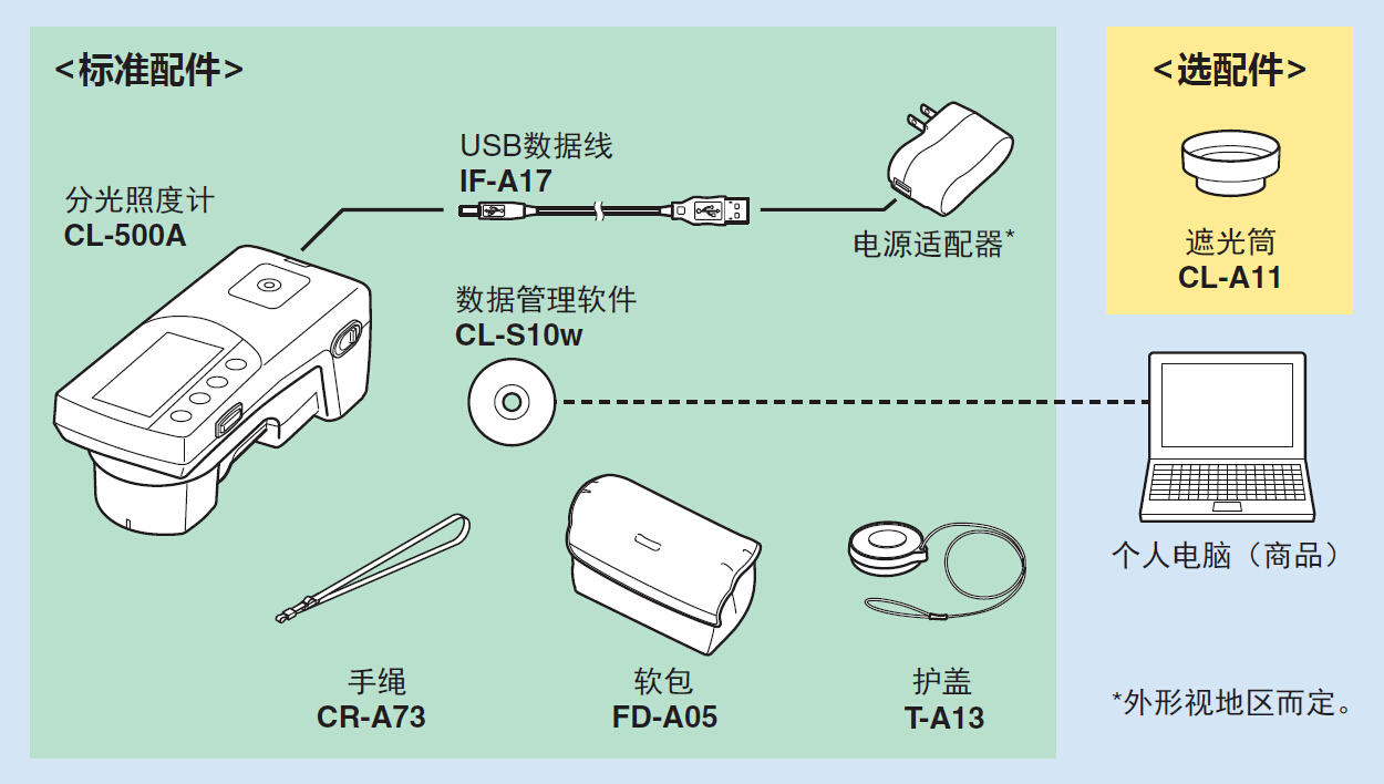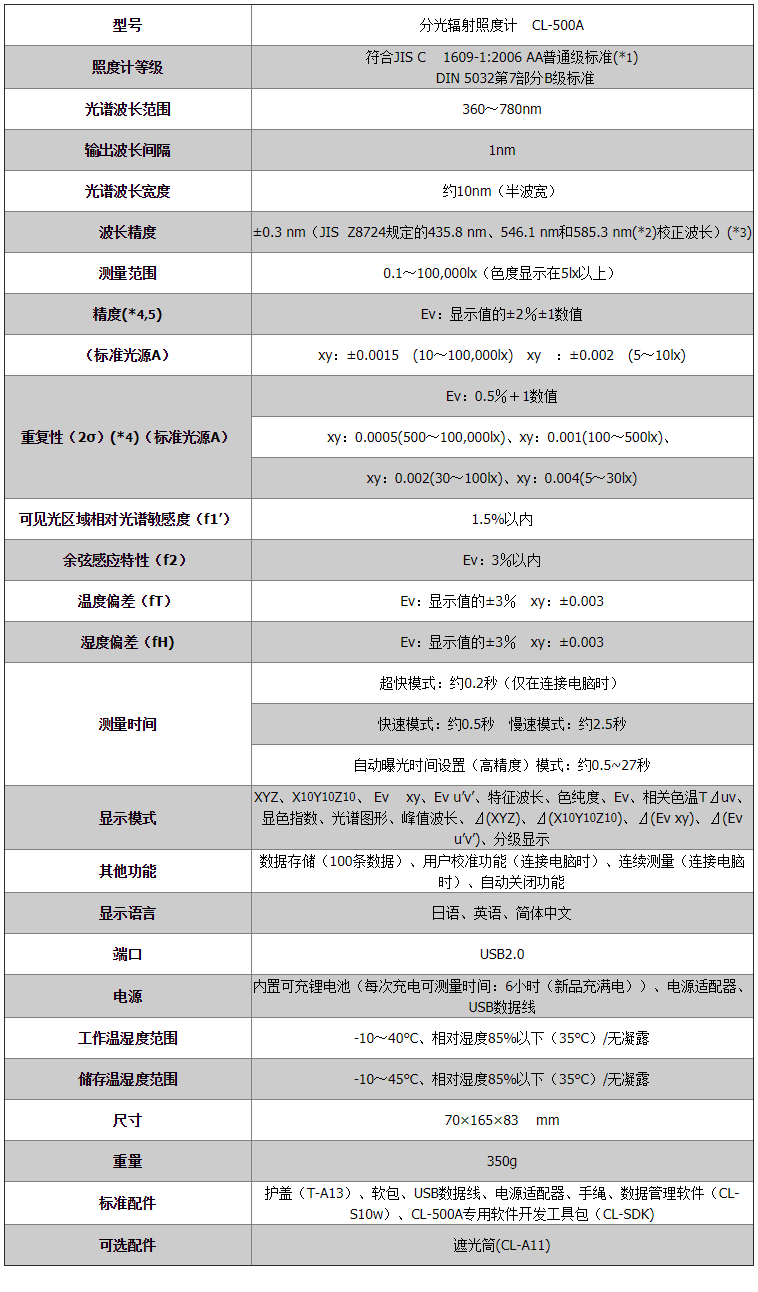 CL-500A符合DIN 5032第7部分B级标准和JIS C 1609-1:2006 AA普通级标准, 是首款符合DIN和JIS两种标准的便携型分光辐射照度计。