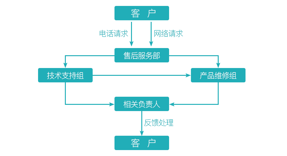2、无论客户是电话请求还是网络请求,客服中心都会根据客户反馈的问题进行分类后直接转接相应部门,部门负责人会根据客户请求进行处理并给出相应解答,处理结果将会交接给区域负责人,区域负责人将问题反馈给客户并配合处理一切售后事务。